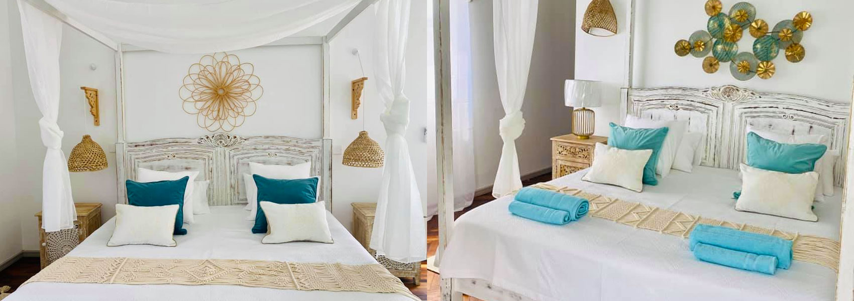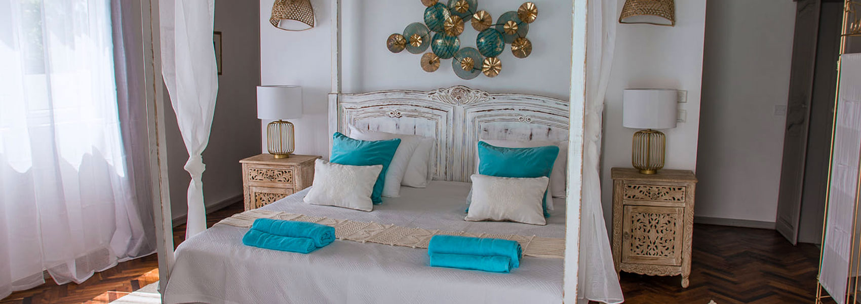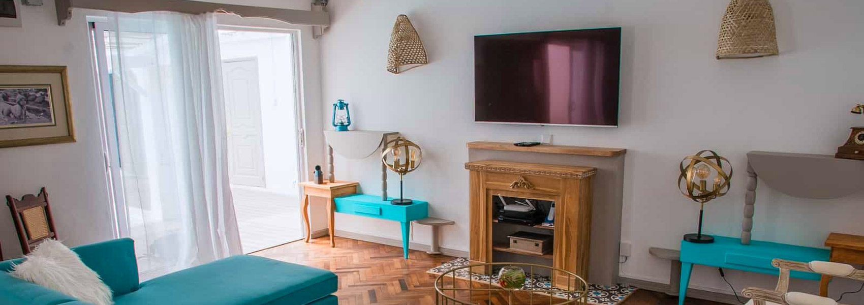Renovated with a colonial-inspired design, the property features parquet floors, antique-style furniture, and vintage décor that create a timeless, airy ambiance. Soft turquoise accents, wooden details, and bright, open spaces make every corner soothing and inviting.